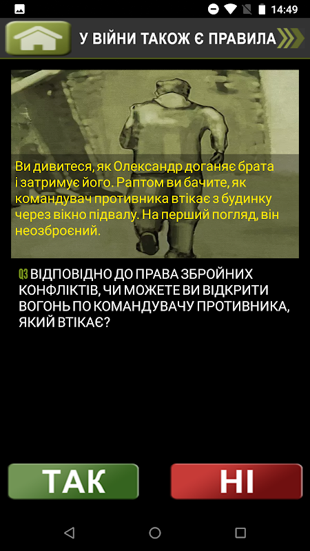 Ви знайдете всі відповіді в цій вікторині. Ви пройдете через 28 сценаріїв, що охоплюють такі теми, як «Тактика ведення війни», «Основні права», «Медична допомога», «Зброя» або «Захист дітей». Коли Ви закінчите всі теми, то зможете перейти на рівень командира з більш складними сценаріями.