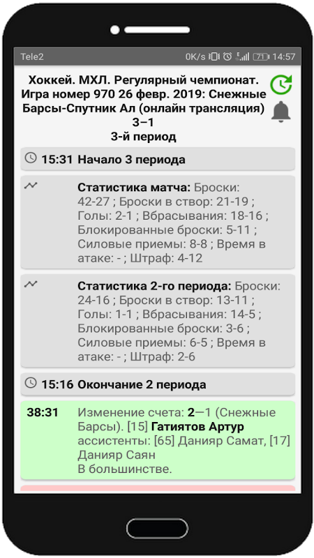 当您单击所需的游戏时,将打开文本曲棍球广播,其中会自动显示比赛事件并自动更新。球门以绿色罚金突出显示-红色以视觉感知冰球锦标赛的重点。