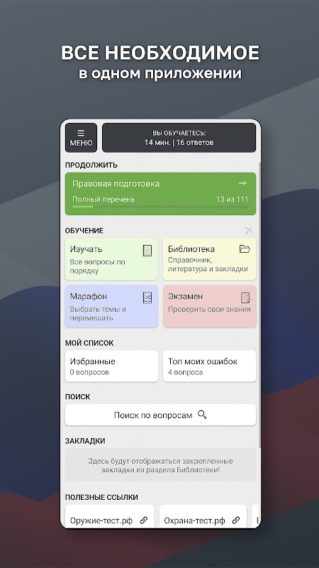 该应用程序还包含剥夺武器许可证的理由清单、处理枪支和狩猎领域的现行监管法律法案文本,并按主题方便地细分(FZ-150“武器”,《刑法典》中的文章)俄罗斯联邦行政违法法典、第 477 号命令等的条款)。