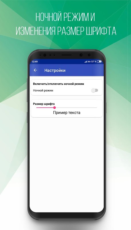• Возможность настройки приложения: изменение размер шрифта и ночной режим;
