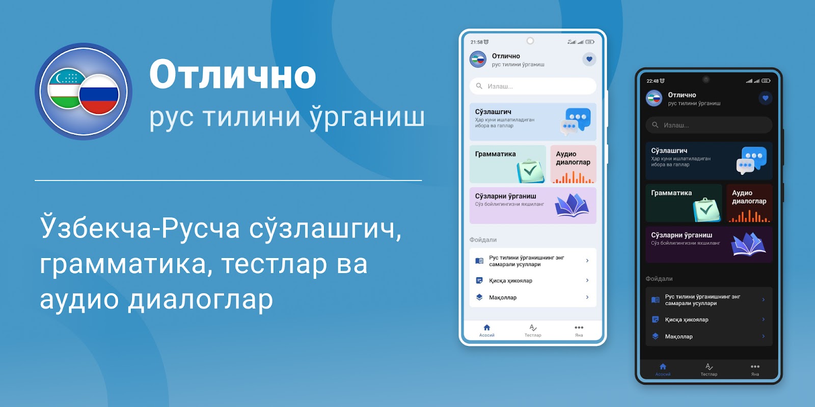 Ozbekcha-Ruscha-Ozbekcha suzlashgich、语法、测试 va 音频对话 hammasi bitta dasturda