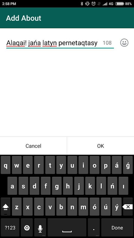 Latin keyboard for newly accepted latin alphabet for kazakh language. Now symbols like "á ń ǵ ý ú ó" can be typed easily. Dashed letters called Acute are found on the right side of board.