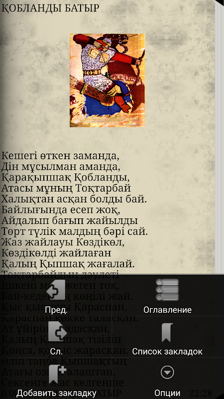 “Kobylandy Batyr” - 一万多行的史诗,战功Kobylandy,他的竞选反对喀山可汗和Alshagira的故事。史诗般的作品一般很难的时间来安装,因为它们是流传下来的一代又一代由不同的艺术家 - zhyrshy,有时接触到的变化,根据变化,需要和社会的利益。因此,存在不同的选择对他们来说,抛光语言。围绕它的研究人员确定了史诗“Kobylandy”分布在两个版本 - 一个古老,形成在遥远的过去,后来,一个显著此外,许多事件,事实,从十五世纪大致与图像的解读 - 以整合的力量分散的氏族,部落和涌现的时代哈萨克汗国。但在所有版本的史诗“Kobylandy Batyr”体现了人民的理想的英雄,他的本土后卫。