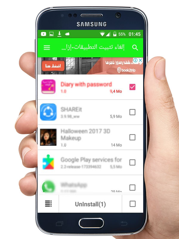 تطبيق إزالة التطبيقات دفعة واحدة وتسريع الجهاز برنامج من السهل جدا استخدامه ما عليك سوى اختيار ما تريد التخلص منه و سيتم إزالة التطبيقات و تنظيف و تسريع الجهاز بسهولة. أنقر على خانة التطبيق و امسحه حتى يتم تحرير مساحة الجهاز
