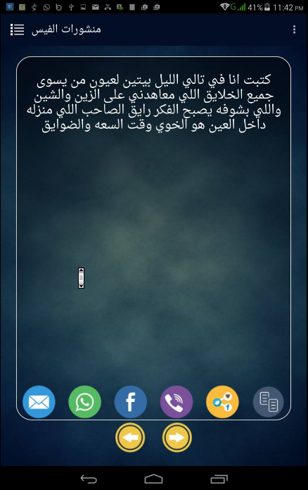 تطبيق بوستات فيس بوك يتحوي على بوستات ( منشورات ) جاهزه في الفيس بوك بحيث يوجد الصوره والنص يمكنك مشاركات هذه البوستات مع الفيس بوك بشكل مباشر ، بالأضافه اذا كنت لا اريد مشاركتها على الفيس بوك بأمكانك تحميل الصوره بشكل مباشر وبأمكانك نسخ النص بالكامل .. واضافة الصوره التي تريدها الى المفضله ..