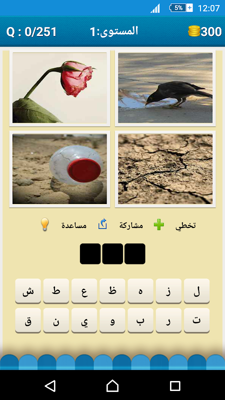 * إضغط دخول و سيتم عرض اللغز المؤلف من أربع صور ومجموعة من الحروف.