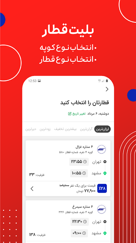 ویژگی خرید بلیط قطار از اپلیکیشن