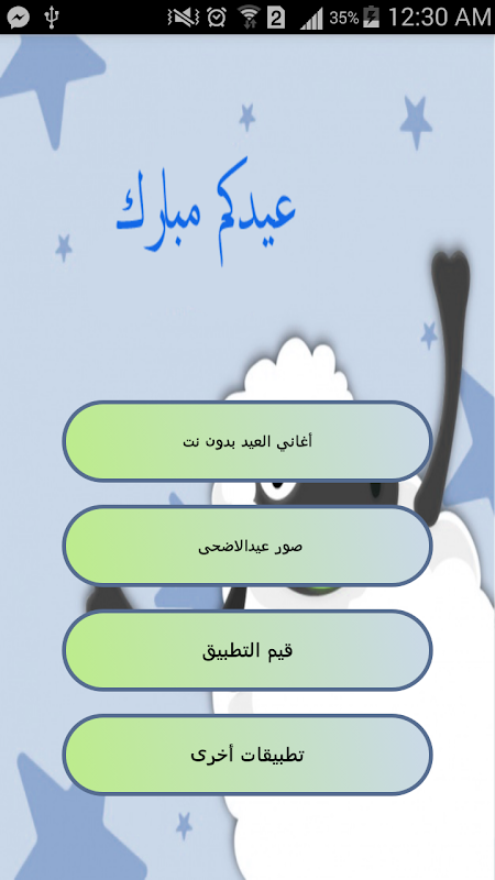 تطبيق يحتوي علي مجموعة من اروع الصور والاغاني العيد منوعة بين اغاني طيور الجنة واغاني عصوم ووليد , اغاني فوزي وموزي وتوتي اهلا بالعيد , اعلان شركة زين يا عيد راما و خروف العيد خروفي خروفي ماء ماء