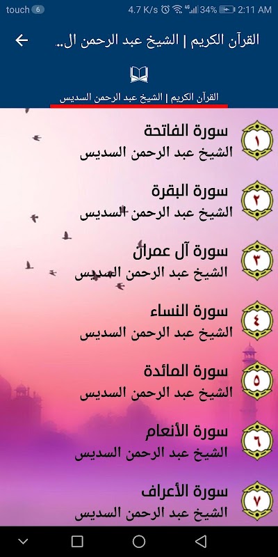 使用 Abdul Rahman Al-Sudais 的声音应用《古兰经》,您可以在指定要听的 surah 的名称(Sheikh Abdul Rahman Al- Sudais 在每个 surah 中背诵。