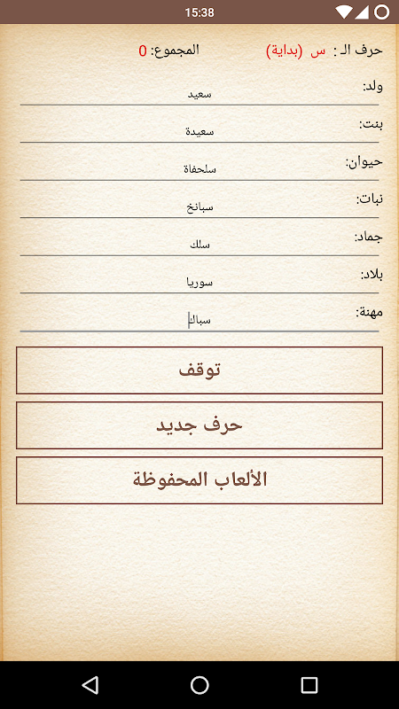 لعبة (انسان حيوان نبات جماد بلاد) المشهورة و المسلية. لعبة تساعد على تطوير المهارات و تنمية المعلومات لدى اللاعبين بالإضافة إلى أنها تساعد في سرعة البديهة. لعبت لأجيال على الورق والآن نقدم لكم إصدار الأندرويد منها.