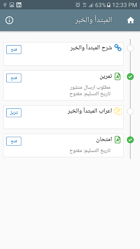 • استعراض الدروس اليومية كما يعرض التفاصيل الخاصة بالامتحانات والواجبات ويمكن للطالب حلها وتقديمها عن طريق التطبيق