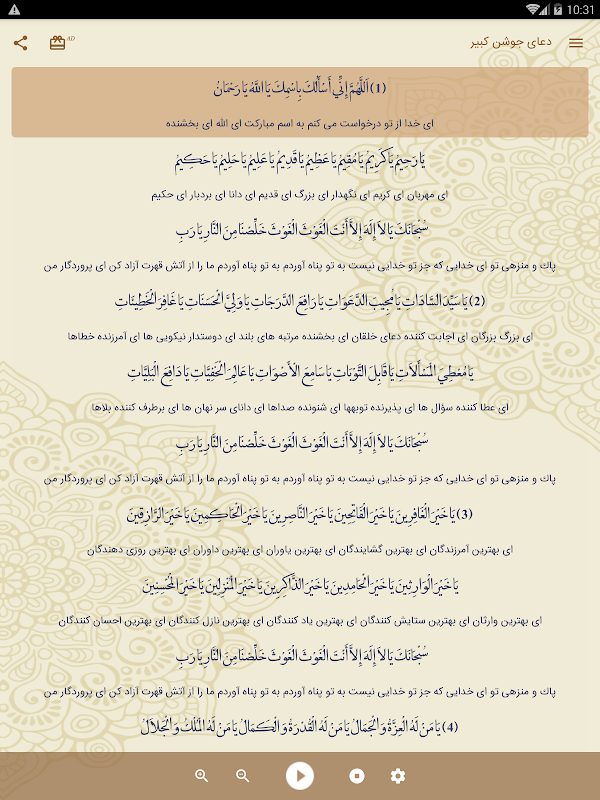 祈求声音大声,外观现代,无需互联网,无需自动滚动和夜间主题,根据旁白,任何人在离开家时读到此祈祷文时,上帝都会祝福他并给他带来很多好处。每个在裹尸布上阅读它的人都不会遭受坟墓的厄运,而在斋月的第一天阅读它的人,上帝就会赐予他“黑夜”的美德,而在这个月中,谁读了三遍,就是上帝的一生,需要。