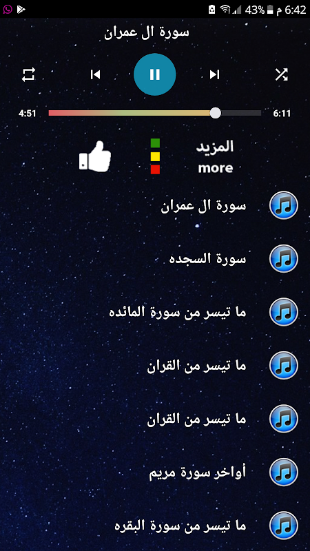 该应用程序包括用谢赫阿卜杜勒·拉赫曼·马萨德的声音朗诵《古兰经》的大部分内容