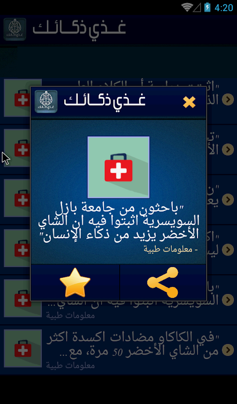 ثقف نفسك مع تطبيق غذي ذكاءك يتوفر على معلومات عامة و ثقافة عامة و هل تعلم و الذكاء في مختلف المجالات، و الهدف الأسمى لغذي ذكاءك هو نشر المعرفة و العلوم و ثقافة عامة و معلومات هل تعلم لتنمية ذكاء العقل و دعوة أصحاب الهواتف إلى استغلال فترة يومية لتغذية ذكاء عقولهم بمعلومات ثقافة عامة و علمية و طبية و تاريخية و دينية و أيضا للتنمية الذاتية. و هل تعلم أنه لا يحتاج غذي ذكاءك إلى الانترنت لكي تتصفحه و تستمتع به في أي زمان و مكان. و يدعم التطبيق نشر المعرفة و ما تيسر من ثقافة عامة و معلومات عامة على الفيسبوك و التويتر و عدة مواقع للتواصل الإجتماعي. و أنت جالس في أي مكان بدون انترنت ثقف نفسك بفتح التطبيق و ولوج كل الأقسام و سوف تستمتع و أنت تفرأ المعلومات و ترفع الذكاء الخاص بك. ذكاء عقلك يعتمد على تشغيله باستمرار و لإثراء مخزونه المعرفي. ثقف نفسك لتعلوا فوق الجميع برجاحة عقلك و الذكاء الذي تتميز به و إضافة ثقافة عامة لذهنك.