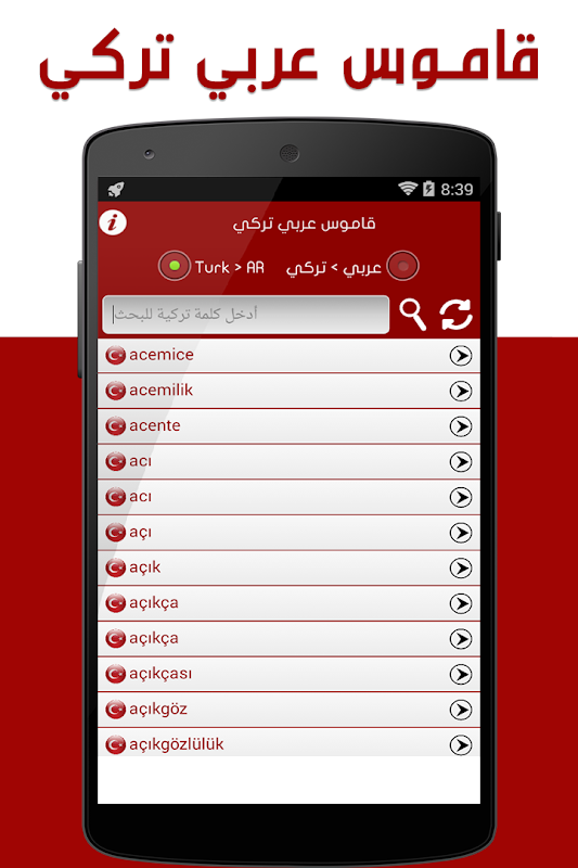 قاموس عربي تركي بدون انترنت ، قاموس شامل ومعاصر يتيح تعلم التركية، ويشمل: ترجمة كلمات وجمل،القاموس العربي التري تطبيق يسمح لك بترجمة الكلمات من اللغة العربية إلى التركية وبالعكس دون الحاجة للاتصال بالإنترنت ومجانًا