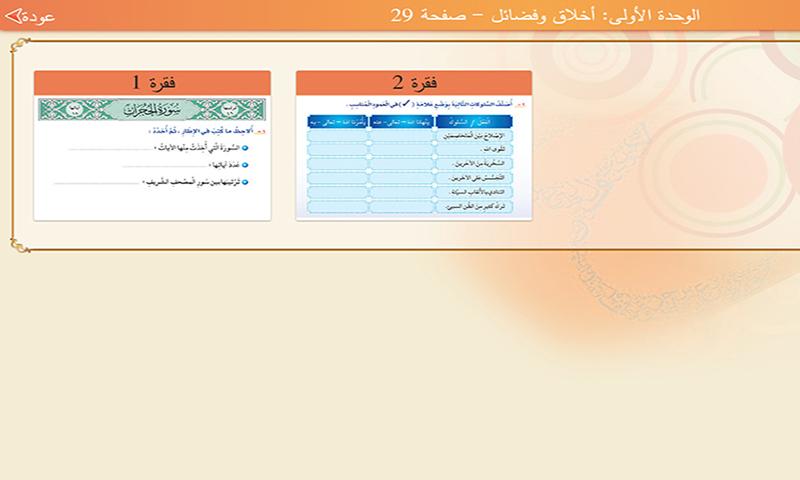 يختار الطالب الوحدة ثم يختار رقم الصفحة فيتم عرض فقرات الصفحة وباختيار الفقرة تظهر الفقرة في صفحة لوحدها بحيث يركز عليها الطالب مع أزار الحل والمسح والتي تتيح للطالب حل التمرين ومسحه لكي يقوم هو بالحل.