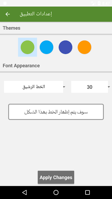 ولإضافة لمسة فنية إلى واجهة التطبيق، أتحنا للقارئ الفاضل إمكانية تغيير لون الخلفية ونوعية الخط العربي وكذا حجم هذا الأخير.