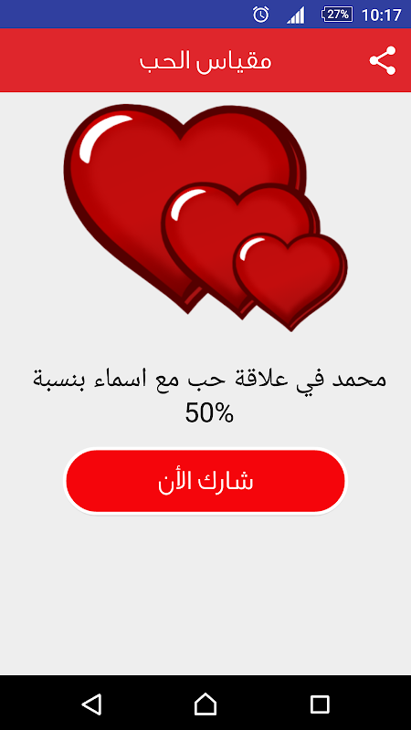 تطبيق مقياس الحب بين شخصين يوضح لك نسبة الحب بين شخصين عن طريق الاسم ، ويمكنك مشاركة النسبة من خلال مواقع التواصل الاجتماعي .
