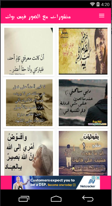 يحتوي تطبيق منشورات مع الصور للفيس بوك على مجموعة كبيرة من الصور الرائعة التي تتضمن منشورات مميزة للفيسبوك، كما يتضمن تطبيق منشورات مع الصور للفيس بوك على صور معبرة وبكلمات مؤثرة للمشاعر التي نشعر بها جميعنا فتطبيق منشورات مع الصور للفيس بوك يشمل عبارات رائعة متنوعة وهذه الصور الموجودة في تطبيق منشورات مع الصور للفيس بوك صممت خصيصا لاستخدامها على مواقع التواصل الاجتماعي كالفيس بوك حيث بإمكانكم استخدام هذه الصور المعبرة على صفحاتكم الشخصية على الفيسبوك أو على المجموعات المنشأة على الفيسبوك