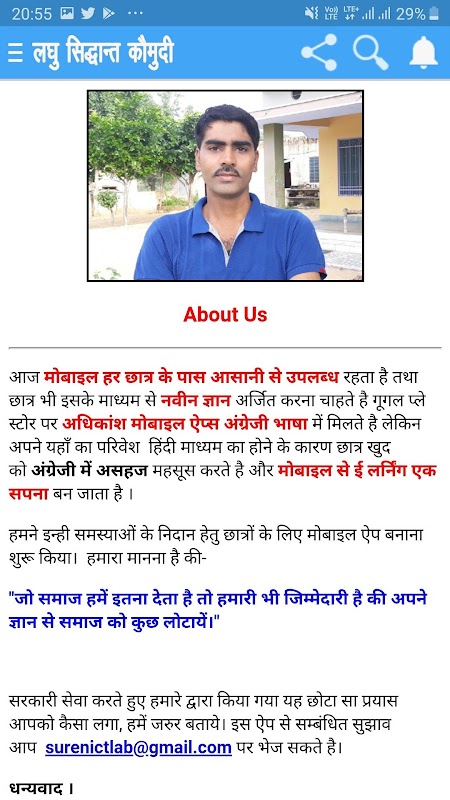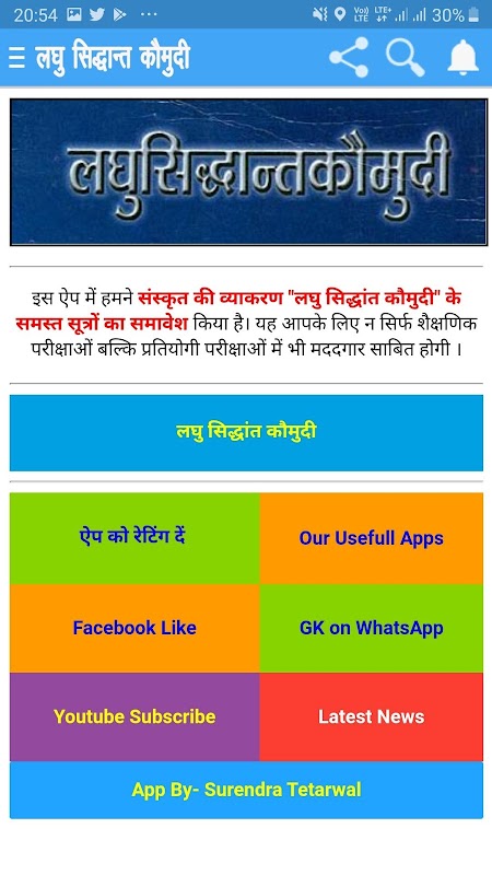 इस ऐप में हमने संस्कृत की व्याकरण "लघु सिद्धांत कौमुदी" के समस्त सूत्रों का समावेश किया है। यह आपके लिए न सिर्फ शैक्षणिक परीक्षाओं बल्कि प्रतियोगी परीक्षाओं में भी मददगार साबित होगी ।