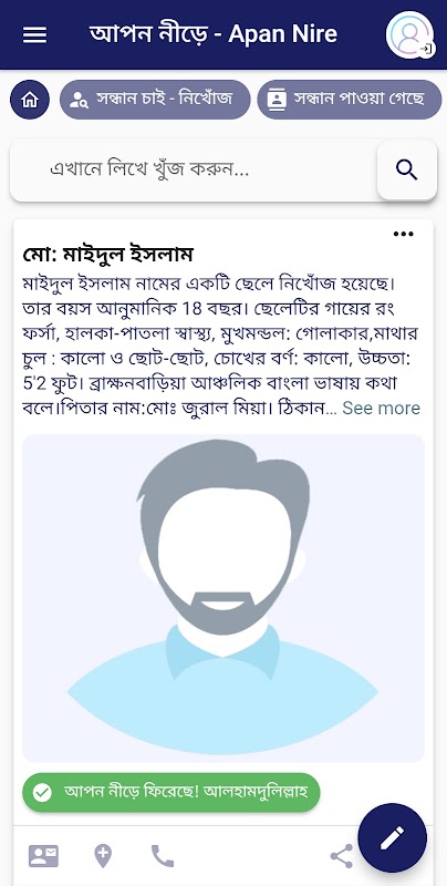 “আপননীড়ে”অ্যাপটিহারিয়েযাওয়াবানিখোঁজআপননীড়েফিরেযেতেসহায়তাকরবেইনশাআল্লাহ。