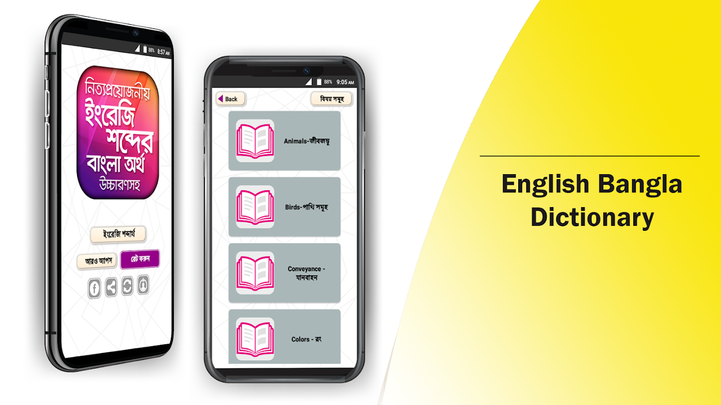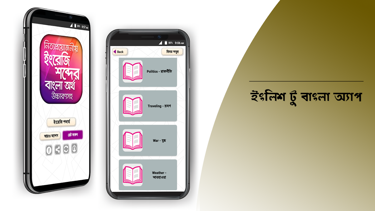 谁想在孟加拉语中学习英语单词,然后他看到单词书英语到孟加拉语的申请对他们来说是离线英语到孟加拉语的词汇。这种类型的离线英语到孟加拉语的字典应用。它还有助于将任何单词翻译成英语到bangla或bangla到英语。在此应用程序中,我们组织了许多带有发音和孟加拉语含义的单词。
