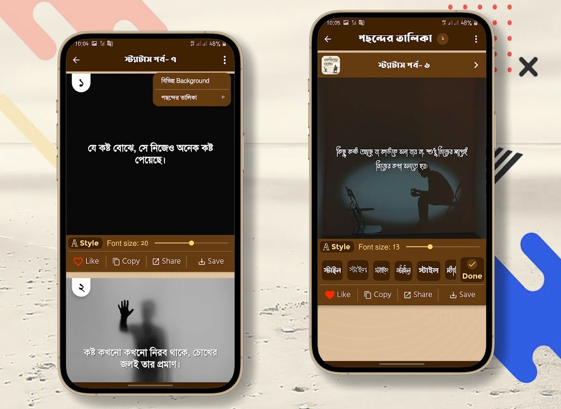 √ ব্যাকগ্রাউন্ডপরিবর্ত,ফন্টপরিবর্তও ছোট-বড় করার সুবিধা এবং ভালোলাগার স্ট্যাটাস টি পছন্দের তালিকায় যুক্ত করা সহ আরো বিভিন্ন সুবিধা থাকছে এই একাকিত্বের স্ট্যাটাসঅ্যাপটিতে।