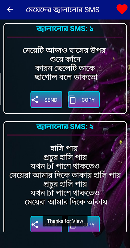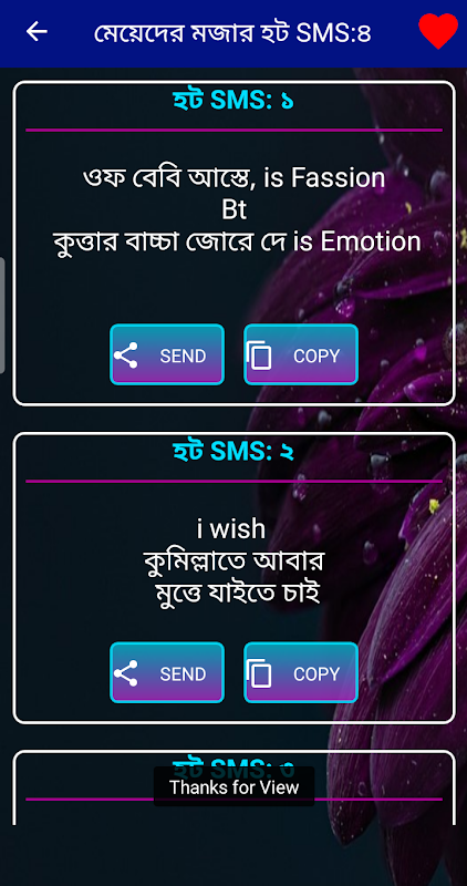 এই অ্যাপসটিতে যে সব মজার এস.এম.এস আছে তা অপনি আপনার বন্দুদের সাথে ১ কিল্কে কিল্কে কপি এবং শেয়ার করতে পারবেন ।