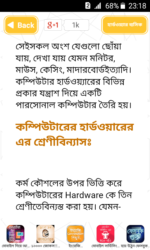 Computer learning in bangla is a free educational app. It’s more like a computer learning book or computer course in bangla. In today’s world basic knowledge of computer or any kind of computer training is a must. We are living in a world of technological advancement and to cope up with the surroundings learning various computer course is very much effective. Moreover, freelancing and outsourcing have become so much popular these days. Online earning bd has also become popular as well. To fulfill the demand of bd people who want to earn money online or want to have basic computer knowledge training to gain some technological concept we made this app.