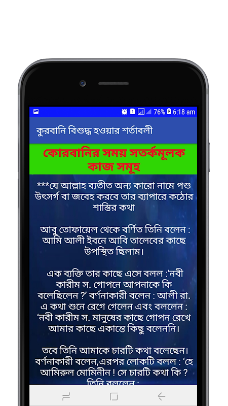 কুরবানী এর মাসায়েল জানা সবার জন্য অত্যন্ত জরুরি. কুরবানী এর নিয়ম ও ইতিহাস জানলেই কুরবানীর গুরুত্ব সবাই উপলব্ধি করতে পারবে ।কুরবানী ঈদ বা ঈদুল আযহা মুসলমানদের জন্য দ্বিতীয় আনন্দময় ধর্মীয় উৎসব।কুরবানি (Qurbani) কুরবানীর মাসায়েল একটি বাংলা ইসলামিক অ্যাপ।কুরবানী Qurbani অর্থ ত্যাগ। ঈদুল আযহা (eidola Asha) মূলত ত্যাগের উৎসব। কুরবানির সময় মুসলমানেরা তাদের সাধ্যমত আল্লাহর সন্তুষ্টি অর্জনের জন্য উট, গরু, দুম্বা কিংবা ছাগল কোরবানি বা জবাই করে। মহান আল্লাহ পাক পবিত্র কোরআন শরীফে কুরবানীর ইতিহাস সম্পর্কে সুন্দর বর্ননা দিয়েছেন যা থেকে আমরা কুরবানির গুরুত্ব ও তাৎপর্য বুঝতে পারি।কুরবানি বা কোরবানি দেওয়ার সুন্নাহ রয়েছে। যে কোনো ভাবে , একটা পশু জবাই করলেই কুরবানি বা কুরবানী হয় না। যেমন একটি মাসালা বা মাসায়েল হচ্ছে, ঈদুল আযহার নামাজের আগে কুরবানি করা সঠিক নয়- এরকম কেউ করলে কুরবানী বা কোরবানি হবে না।