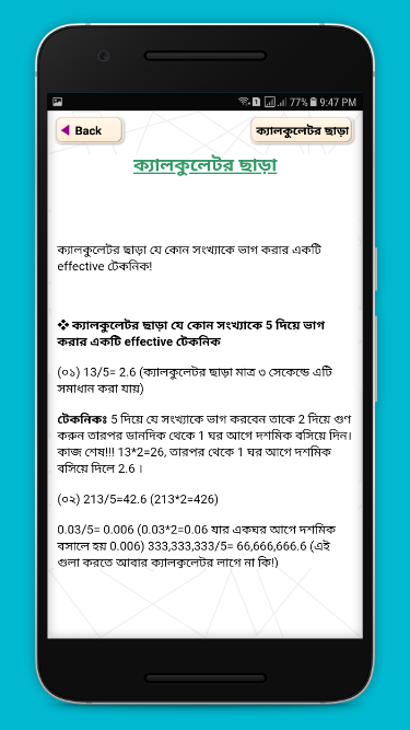 The entire questionnaire of 20 or 25 or 30% of the jobs in Bangladesh with BCS comes from different parts of the math and the mental skills part. There are 40% and (especially in the banking recruitment test) employment. If your math base is strong, you can solve any problem very easily at a very short time. Keep in mind that for every math test, the time will be allocated only 35-40 seconds. The solutions mentioned in this app have been given to save time only. So today our developer "Awesome BD APP" has created this app for you with "shortcut technique for math". Remember, there is no substitute for practice in the case of income.