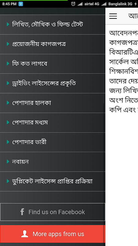 ঢাকায় বাংলাদেশ রোড ট্রান্সপোর্ট অথরিটি (বিআরটিএ) মিরপুর, ঢাকা মেট্রো-১,২,৩ সার্কেল রয়েছে। এছাড়া প্রত্যেকটি বিভাগের জেলা থেকেও আপনি করতে পারবেন। এই এপে পাবেন ড্রাইভিং লাইসেন্স পেতে হলে যা যা করণীয় তার সব।