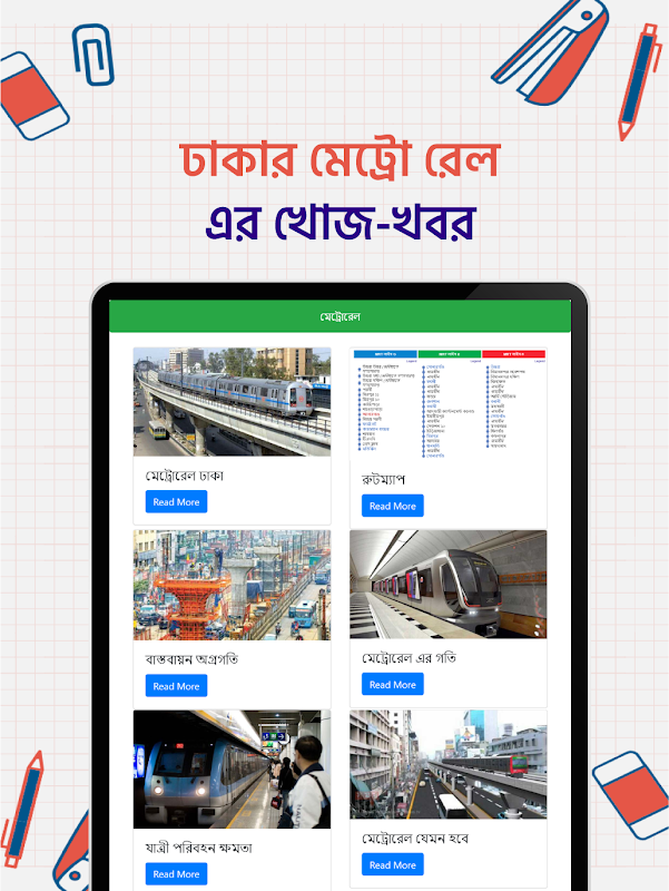 বাংলাদেশের মানচিএ উজ্জল করে আসছে মেট্রোরেল। এই মেট্রো ট্রেন এর গতি হবে ঘন্টায় শত কিলোমিটার যা ঢাকা ম্যাপ অতিক্রম করবে চোখের নিমিষে। বাংলা সংবাদপত্র যারা পড়েন ও বাংলাদেশ tv যারা দেখেন তারা বাংলাদেশ বিষয়াবলী ও বাংলাদেশ মানচিত্র সম্পর্কে জানেন। গত কিছুদিন যা বাংলাদেশ পত্রিকা দখল করে আছে তা হল ট্রেন কোথায় আছে? কত দূর অগ্রগতি হল, ট্রেন টিকিট কোথায় পাওয়া যাবে, ট্রেনের সময় বা ট্রেন time কেমন হবে ইত্যাদি। তাই যারা অলরেডি ঢাকা বাস রুট অ্যাপ ব্যবহার করছেন, আর বাস টিকিট, বাস সার্ভিস, বাস ভাড়া ইত্যাদি জানতে পারছেন তাদের জন্য সুখবর। মেট্রোরেল অ্যাপ নিয়ে আসছে ঢাকার মেট্রোরেল এর সব তথ্য।