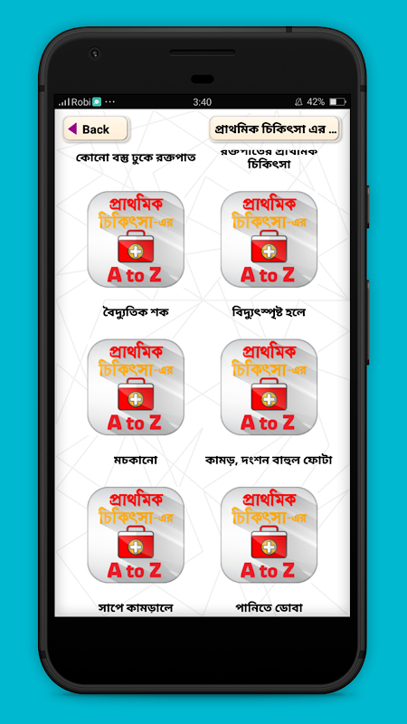 Minor injuries happen every day, and most are easy to treat at home. But to handle them quickly and calmly, you need to know what to do and have the right supplies.In this app we have tried to cover up First Aid Guide,Latest Basic First Aid Book or First Aid Bangla. There are Easy First Aid suggestions on First Aid Emergency,Baby and Child First Aid etc.Everyone should be concerned about it. And in order to own safety some stuffs like First Aid box and First Aid Medicines should be keep close to us. This app is build mainly on this major topic,hope that everyone will love it.