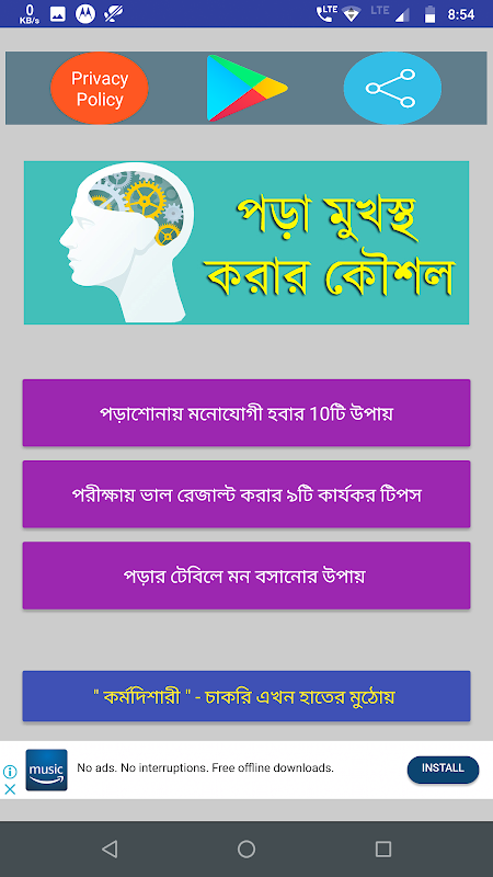 "পড়া মুখস্থ করার কৌশল" এর মাধ্যমে আপনি খুব সহজেই পড়া মুখস্থ করতে পারবেন | পড়া মনে থাকে না’ কিংবা ‘যা পড়ি তাই ভুলে যাই’, এই অভিযোগটি প্রায় সবার। পড়া মনে না থাকা নিয়ে কম-বেশি হতাশায় ভুগে নাই এমন কাউকে খুঁজে পাওয়া বেশ মুশকিল ব্যাপার। তবে বিষয়টি নিয়ে হতাশ হলে চলবে না। কয়েকটি সহজ কৌশল মেনে চললেই এ জাতীয় উৎকট ঝামেলা থেকে কিছুটা হলেও মুক্তি পাওয়া সম্ভব। সেরকমই সহজ কৌশল নিয়ে আমাদের এই অ্যাপ ।