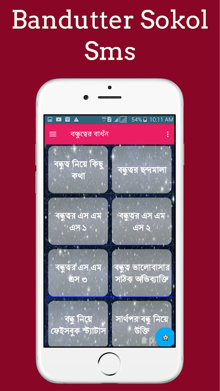 সবাইকে আন্তরিক ভাবে ধন্যবাদ। প্রথমেই আমার সালাম গ্রহন করবেন। আমাদের অ্যাপের মধ্যে আপনি বন্ধুত্বের সকল এসএমএস খুব সহজেই পেয়ে যাবেন। প্রতিটি এস এম এস "Share""COPY""Send" এই তিনটি পর্যায়ে আপনি আপনার মনের মানুষকে পাঠাতে পারবেন।শুধু আপনাদের সুবিদার্থে আমার অক্লান্ত পরিশ্রমের ফলশ্রুতিতে এই অ্যাপটি বানানো।