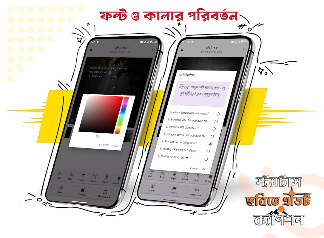 🔹 স্ট্যাটাস এডিট ফিচার- গ্যালারী থেকে ছবি এনে স্ট্যাটাস তৈরি করা যাবে। ছবি তৈরী করার সময় লেখার ফন্ট、কালার、সাইজ ও ব্যাকগ্রাউন্ডপরিবর্তনকরতেপারবেন। পিকচারে যে কোন টেক্সট বসিয়ে নিজস্ব ডিজাইন তৈরিকরাযায়।