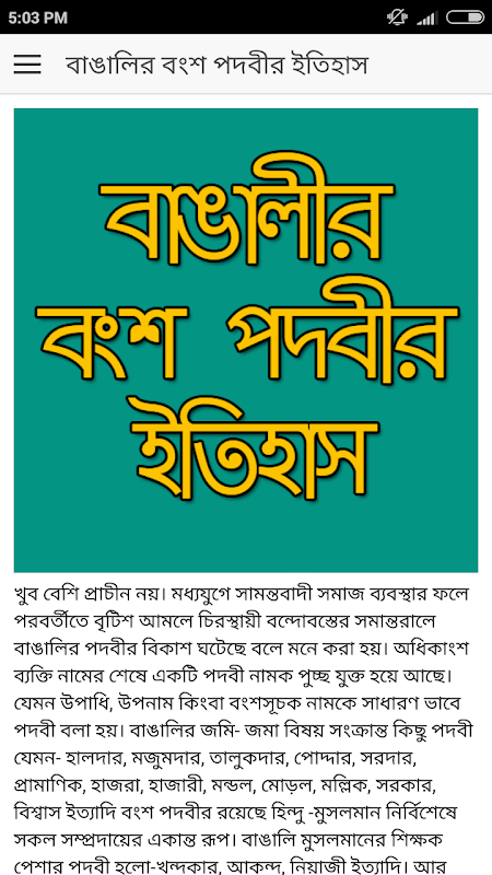 孟加拉王朝的历史并不是很古老。由于中世纪封建社会制度的影响,人们认为孟加拉人的地位在英国时期后期与永久定居平行发展。大多数人的名字后面都有一个尾巴。这样的头衔、姓氏或宗谱名称通常称为姓氏。孟加拉语的一些头衔与土地存款问题有关,例如 Haldar、Majumdar、Talukdar、Poddar、Sardar、Pramanik、Hazra、Hazari、Mandal、Moral、Malik、Sarkar、Biswas 等,是所有社区的专有形式,而不管印度教——穆斯林。孟加拉语穆斯林教师的头衔是 Khandaker、Akand、Niazi 等。孟加拉印度教徒的教师职称是 Dwivedi、Trivedi、Chartuvedi 等。