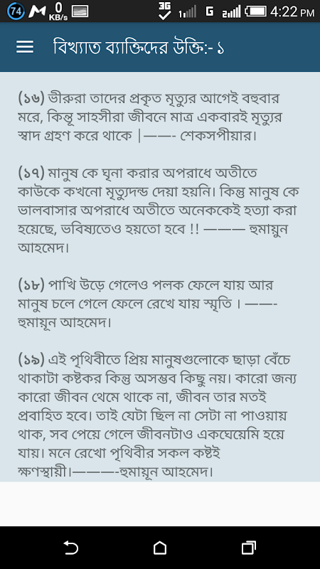 Multicode Lab发布了一个很棒的孟加拉语报价收集应用程序。每个孟加拉人都喜欢huumayun ahmed和muhammad ali的孟加拉语引用,也喜欢kazi nazrul伊斯兰教和rabindranath引用。