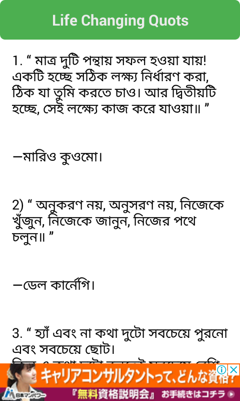 Life changing 1100+ QUOTS is completely free & easy to use .Attractive design & world famous quotes in bangla and English people include this apps. In this apps, most of the quotes is so valuable and life changing .