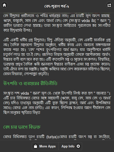 ঋগ্বেদ থেকে তৎকালীন নারীশিক্ষা তথা সমাজের একটি পরিপূর্ণ চিত্র পাওয়া যায়। অথর্ববেদ থেকে পাওয়া যায় তৎকালীন চিকিৎসাবিদ্যার একটি বিস্তারিত বিবরণ। এসব কারণে বেদকে শুধু ধর্মগ্রন্থ হিসেবেই নয়, প্রাচীন ভারতের রাজনীতি, অর্থনীতি, সমাজ, সাহিত্য ও ইতিহাসের একটি দলিল হিসেবেও গণ্য করা হয়।
