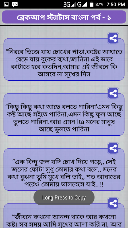 আপনিযাকেআপনারপৃথিবীভাবছেনসেতআপনাকেকিছুইভাবেনি。 তাহলেআপনিকেনোআপনারজীবননষ্টকরবই তাইআপনাদেরএইব্যর্থপ্রেমেরকিছুস্ট্যাটাসওমেসেজনিয়েআমাদেরএইঅ্যাপসটি。 কষ্টকেসহ্যকরতেনাপেরেঅনেকেইএইপৃথিবীরবুকথেকেচিরতরেচলেযায়。 এই অ্যাপটিতে রয়েছে ভালবাসারকষ্টমানুষকেনরকেরকষ্টেরচাইতেওবেশিযন্ত্রনাদেয়এবংপাথরচাপাকষ্টবুকেথাকে。 কষ্টেরকথাবলিকাকে?? কষ্টযখনমনেরমাঝেদিয়েযায়ব্যথাসবাইতখনভুলেযায়সম্পর্কেরকথা。 .কষ্টেরএসএমএস,চাপাকষ্টআমারতুমিবুঝবেনাশুধুআমিবুকেরতাজারক্তক্ষরণনিরবেবয়েচলি。 ভালবাসারমানুষটিতাকেসারাটিজীবনদুঃখআরকষ্টদিয়েথাকে。 তাদের আবেগ পূর্ণ এই