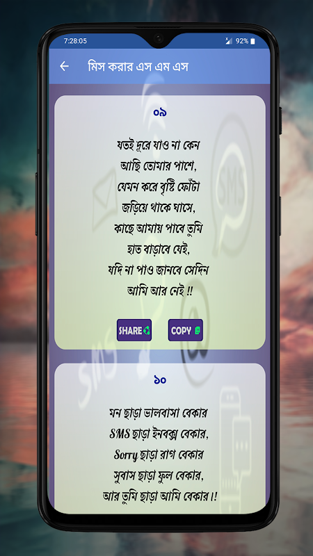 আর আপনি সহজেই এসএমএস ও স্ট্যাটাস গুলি কপি এবং শেয়ারর করতে পারবেন। সকল ক্যাটাগরি আলাদা আলাদা ভাগ করে দেওয়া হয়েছে, যাতে করে আপনার বুঝতে সুবিধা হয়ে।