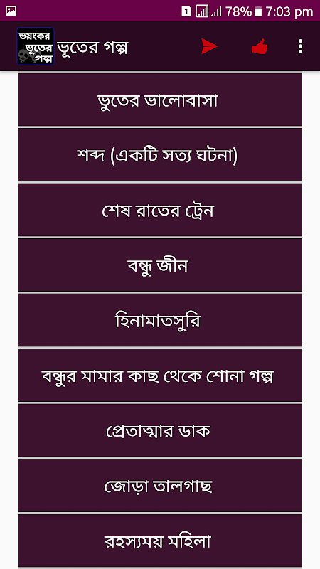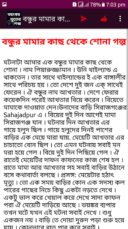 আমরা অনেকেই ভুতে বিশ্বাস করি না, কিন্তু ভুতের গল্প পড়তে ও শুনতে ভালো লাগে সবার। ভুতের গল্প পড়তে বা শুনতে আলাদা একটা রোমাঞ্চকর পরিবেশ সৃষ্টি হয় আমাদের চারপাশে।গা শিউরে উঠা এমন কিছু সত্য ঘটনা নিয়ে সাজানে হয়েছে ভূতের গল্প অ্যাপটি।আমরা যারা ভূতের গল্প পড়তে পছন্দ করি বিশেষ করে তাদের জন্যই।ভয়ঙ্কর ও রোমহর্ষক ভূতের গল্প সমগ্র।ভূতের গল্প শুনতে ভয় লাগলেও এই গল্প সবাই শুনতে চায়। বাঙ্গালীরা কাল্পনিক বা ভূতের গল্প শুনা শুরু করে ঘরের মুরুব্বীদের মা-বা, নানা-নানী, দাদা- দাদী মুখ থেকে। ভয়ঙ্কর সত্য ভূতের গল্পের নিয়েই এই অ্যাপটি তৈরি করা হয়েছে। আশা করি প্রত্যেকটি গল্পই আপনাকে এক রোমাঞ্চ কর পরিবেশে নিয়ে যাবে।এখানে উল্লখিত প্রত্যেকটি গল্পই সত্য যা নেওয়া হয়েছে।। যাদের সাথে অলৌকিক ঘটনা গুলি ঘটেছে।