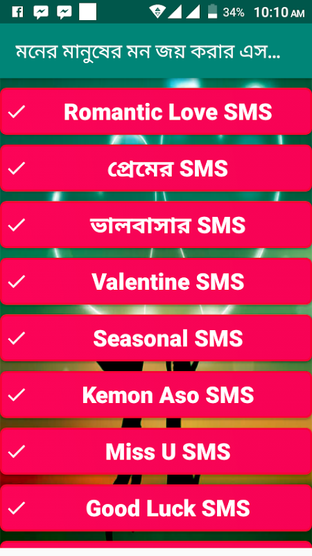 ভালোবাসা মনের মধ্যে গুরপাক খায় মুখে আসে না সে সব কথা নিয়েই সাজানো এবস । মনের মানুষ এর কাছে কথা বলতে বুঝি আসেনা এবার আসবে কপি করে পাঠিয়ে দাও এস,এম,এস প্রিয়জন এর কাছে । মন জয় করতে আমাদের বিশেষ আকর্ষন আমাদের এই এসএমএস বা মনের মানুষদের মন জয় করার এসএমএস। ভালোবাসা জমিয়ে তুলতে বা মানুষকে খুব কাছে পেতে আমাদের এই এসএমএস গুলো আপনাকে সাহায্য করবে। সুন্দরি মেয়েদের পটাতে বা মেয়েদের প্রেমের ফাদে ফেলতে হলে অবশ্যেই আপনাকে টিপস গুলো জানতে হবে। দেখা যায়, অনেক মানুষ সারাদিন প্রিয়তমার কথা ভেবে আবেগের বসে নাওয়া খাওয়া ছেড়ে দিয়েছেন। মানুষ অনেক রকম ভাবেই কষ্ট পেয়ে থাকে যার মধ্যে অন্যতম হলো কাউকে ভালোবেসে কষ্ট পাওয়া । মনের মানুষের কাছ থেকে কষ্ট যা অনেক কষ্টের হয়ে থাকে আর এই কষ্ট চাইলেও মুখে কাউকে বুঝাতে পারেনা ।