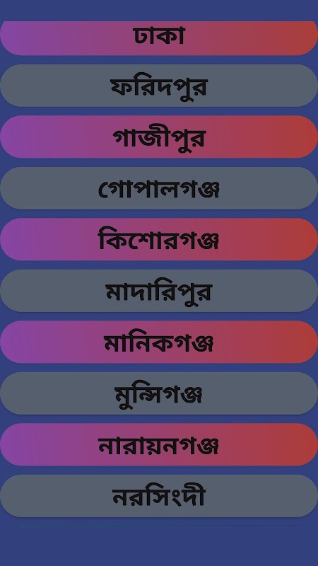 নরসিংদী, গাজীপুর, শরীয়তপুর, নারায়ণগঞ্জ, টাঙ্গাইল, কিশোরগঞ্জ, মানিকগঞ্জ, ঢাকা, মুন্সিগঞ্জ, রাজবাড়ী, মাদারীপুর, গোপালগঞ্জ, ফরিদপুর ,