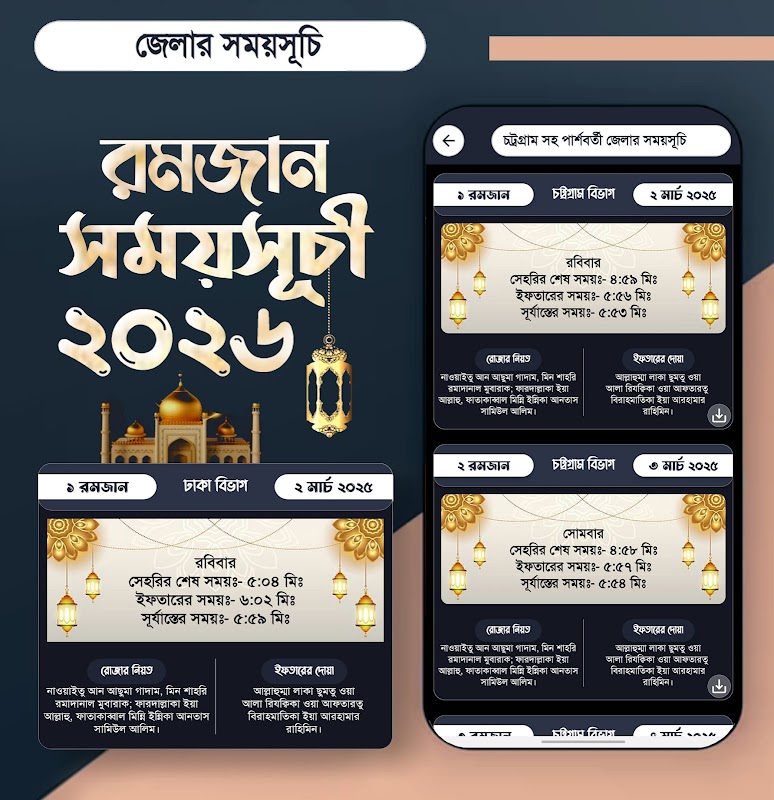 ২০২৬ সালের রমজানের ইফতার ও সেহরির সময়সূচী। ইসলামিক ফাউন্ডেশন থেকে ২০২৬ সালের রমজানের সময়সূচী প্রকাশ করা হয়েছে, এবং আমরা এ থেকে সকল জেলার জন্য রমজানের সময়সূচি তুলে ধরেছি। অ্যাপটি ভালো লাগলে ফাইভ স্টার রিভিউ দিয়ে আপনার মতামত কমেন্টের মাধ্যমে আমাদের জানান। ধন্যবাদ…