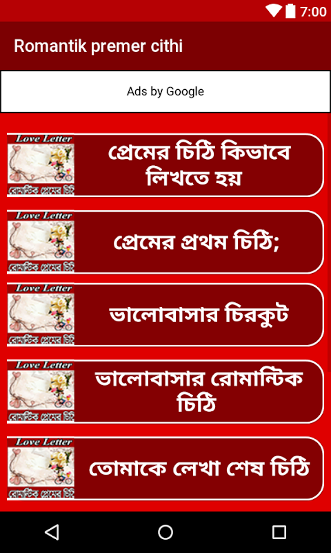 ভালোবাসার চিঠি সমূহঃ প্রেম করেছেন কিন্তু প্রেমিকাকে চিঠি লেখেননি? মিস করেছেন, আর তাই চট করে পড়ে নিন অন্যের মিষ্টি প্রেমের দুষ্ট চিঠি। আইডিয়া নিয়ে প্রিয়জনকে চমকে দেওয়ার মত একটা চিঠি লিখে ফেলুন!তাই আপনাদের জন্য এই এপ্লিকেশনে অসংখ্য প্রেমের চিঠির অর্ন্তভূক্ত করা হয়েছে।