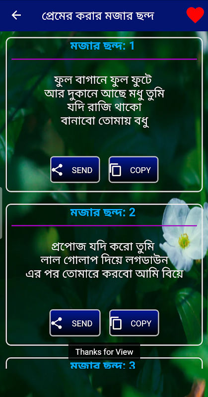এই অ্যাপসটিতে যে সব মজার এসএমএস আছে তা অপনি বন্দুদের সাথে ১ কিল্কে কপি এবং শেয়ার করতে পারবেন ।