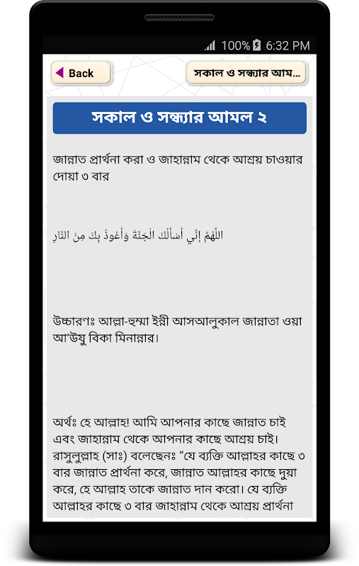 অ্যাপটি মূলত পবিত্র কোরআন ও হাদিসের আলোকে যত ধরনের সকাল সন্ধ্যার আমল রয়েছে সেসব আমলের ভাণ্ডার । উদাহরণস্বরূপ একটি দোয়ার বাংলা অর্থ নিম্নে দেওয়া হল –